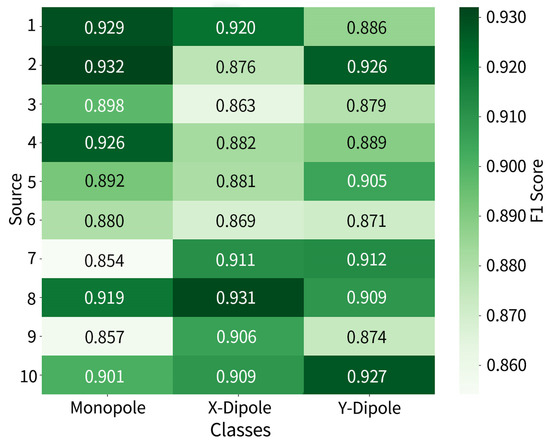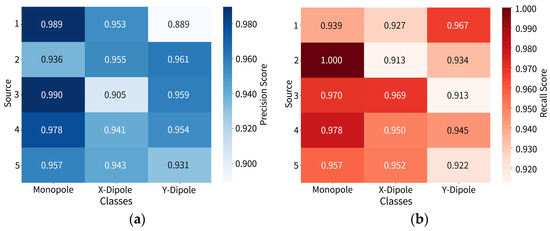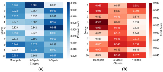 Furthermore, the identification metrics—precision, recall, and F1-score are shown in Figure 5 and Figure 6, remaining above 0.990 across all categories, with the highest F1-score reaching 0.998 for the -direction dipole, demonstrating the model’s stable and fine-grained identification capability under complex input structures. The F1-score heatmap further shows consistent performance across the two sources, with no noticeable variation due to spatial differences. Similarly, the heatmaps of precision and recall confirm that the internal attention mechanism effectively captures the structural association between source type features and spatial patterns in the CSM image.