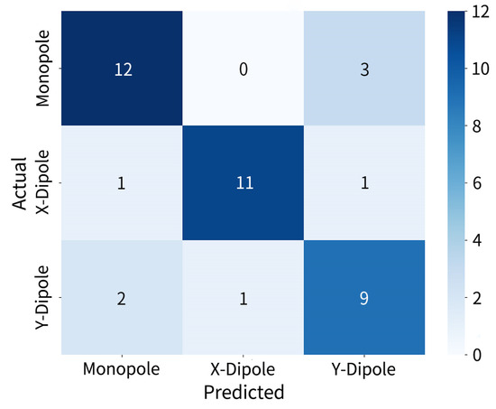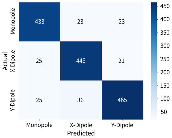 For the case with a fixed source count of ten, the confusion matrix is presented in Figure 10, showing that the model maintains a prominent diagonal dominance. The numbers of correctly identified monopoles, -direction dipoles, and -direction dipoles are 433 out of 479, 449 out of 495, and 465 out of 526, respectively. However, the misidentification rate increases compared to the previous two cases, with a certain degree of cross-type misidentification occurring between monopoles and dipoles. This indicates that under high source density, the decision boundaries between source types begin to be affected by spatial aliasing and feature ambiguity, revealing a degree of boundary generalization error in the model structure.