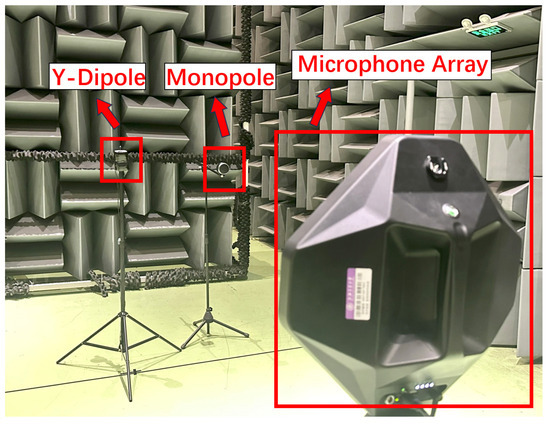 In terms of source construction, as shown in Figure 14b, the monopole source was simulated using a single independent Bluetooth speaker (Thinkplus BT version Speaker K30), which emitted a 3000 Hz sine wave utilizing its point-like radiation characteristics. The dipole source was constructed using two identical speakers that emitted out-of-phase signals at the same frequency, thereby forming an approximately ideal dipole radiation field (see Figure 14c). The x-direction and -direction dipoles were implemented by placing the dual-speaker structure horizontally or vertically, respectively. All source signals were uniformly controlled via an external smartphone to ensure accurate phase alignment between the two sources and consistency with the main frequency used in the simulation.
