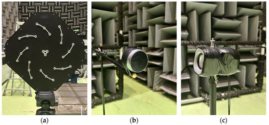 Experimental equipment: (a) microphone array; (b) monopole source; (c) x-dipole source.