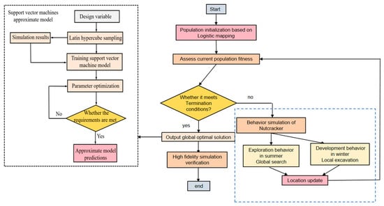Due to the huge computational volume of the acoustic analysis of the inverted bucket steam valve and the time-consuming long optimization, which leads to the low efficiency of the optimal design of the noise reduction structure, the acoustic analysis of the noise reduction elements with different structural parameters in the inverted bucket steam valve is firstly carried out to obtain the sample data set D = {(xi,yi), i = 1, 2, 3 ……}. At the same time, this data set is used to establish the support vector machine approximation model of the noise reduction structure inside the inverted bucket steam valve, the SVM approximation model of the noise reduction structure inside the inverted bucket steam valve is applied for the computation, and the optimal solution is solved by using the NOA genetic algorithm; the process is shown in Figure 1.