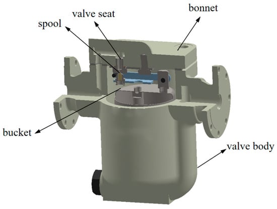 The PN40 DN100 inverted bucket steam valve is the object of study, and the basic principle of work is to use the density difference between condensate and steam so that the inverted bucket produces upward buoyancy, so as to achieve the purpose of regulating the pressure to achieve the closure of the valve. Its structure is shown in Figure 2. It consists of a valve body, valve cover, inverted bucket, valve seat, spool, etc.