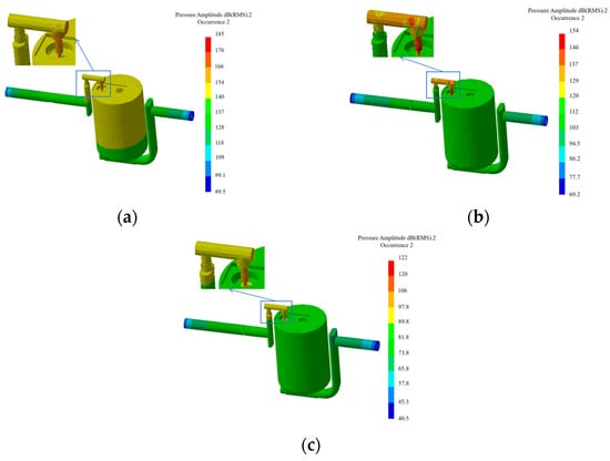 Cloud view of sound pressure distribution at peak frequency. (a) Without orifice plate; (b) orifice plate aperture of 8 mm; (c) orifice plate aperture of 4.5 mm.