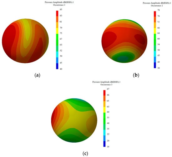 The LMS Virtual.Lab software was applied to set up the spherical sound field monitoring surface one meter outside of the valve, as shown in Figure 6. According to the flow field boundary conditions and sound source excitation, the pressure pulsations are mapped to the acoustic mesh in an energy loss free manner, taking the pressure pulsation cloud at typical frequencies as shown in Figure 7. The acoustic response of the inverted bucket steam valve is solved by taking the pressure pulsation and wall surface pulsation as the excitation sources to obtain the sound field information of the steam valve in three cases, the sampling frequency range of the noise is taken as 20~5000 Hz, and the simulation results are taken as dB(A). The sound pressure maps of the spherical sound field at the peak frequency of the transmission loss for the three cases are taken as shown in Figure 8. The sound pressure of the inverted bucket steam valve without the orifice plate is up to 85 dB(A), the orifice plate with an aperture of 8 mm is up to 78 dB(A), and the orifice plate with an aperture of 4.5 mm is up to 67 dB(A). Comparing Figure 8a,b, it is proved that the addition of the orifice plate can reduce the flow-induced noise of the inverted bucket steam valve.