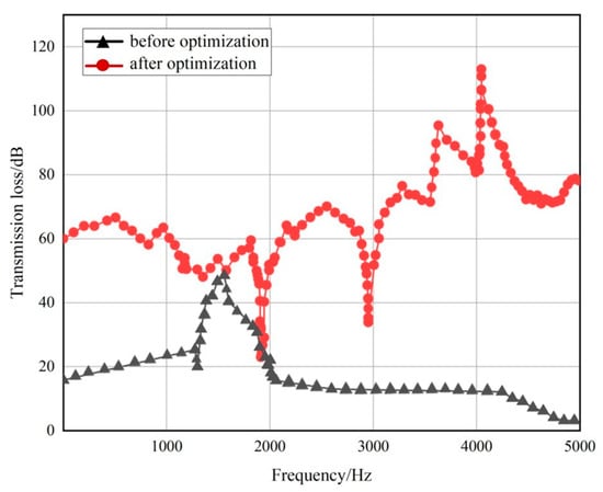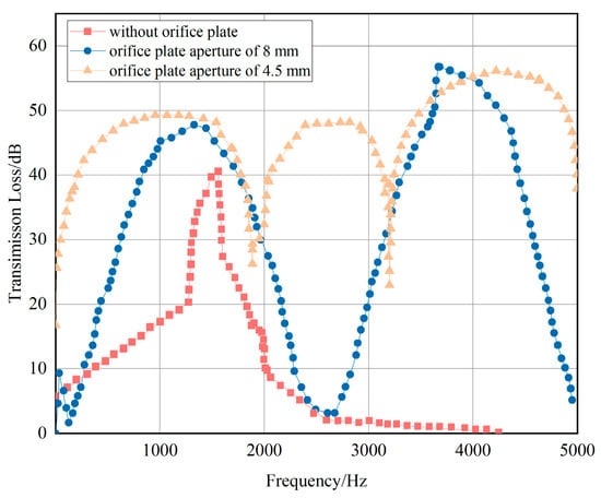Comparing the transfer loss curve of the un-orifice plate in Figure 9 and the transfer loss curve of the test before optimization in Figure 16, it can be concluded that the trend of the transfer loss curve is basically the same, and the error is less than 3%, which proves the accuracy of the numerical simulation method.