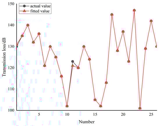 The SVM model for the maximum transmission loss of the inverted bucket steam valve is obtained by using the above optimized SVM parameter training. In order to check the fitting accuracy of the approximation model, Latin hypercubic sampling is used and then four groups of design variables are randomly selected to obtain the support vector machine test set, and the predicted values of the approximation model are compared with the calculated values of the numerical simulation, as shown in Figure 12 and Figure 13. The complex correlation coefficients of the fitted curves for the training set are calculated as R2 = 0.99942 and test set prediction curve complex correlation coefficient R2 = 0.99954. The test set data with a relative error of 0.2% indicates that the support vector machine approximation model f′(x) for the maximum transfer loss of inverted bucket steam valves has a high fitting accuracy and can predict the maximum transfer loss value of inverted bucket steam valves well.