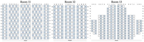 In addition to the assigned IDs, the seats had corresponding labels consisting of a combination of row numbers and alphabetized columns, shown in Figure 3. This made it possible not only to identify the exact seat location for each set of L and GR scores within the test room, but also to match the measured STI values to individual examinees. Details of this process are described in Section 2.3.3.
