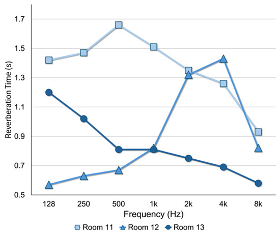As visually represented in Figure 4, the three test rooms exhibited distinctly different RT profiles both in terms of intensity (s) and distribution across the octave band frequency (Hz). Room 11, perhaps due to its large volume (2033 m3), recorded the longest RT0.5–2kHz at 1.51 s which substantially exceeds recommended limits for speech intelligibility [27]. Room 12 yielded a rather favorable RT0.5–1kHz of 0.74 s; however, a notable spike at 2 kHz (1.32 s) to 4 kHz (1.43 s) was observed, suggesting that certain localized reflections may be contributing to longer RT in these higher frequencies. Room 13 showed the most favorable and consistent profile, with an average RT0.5–2kHz of 0.79 s and minimal variation across frequency bands. The presence of large drape curtains on the rear walls likely contributed to minimizing the RT in the mid- to high-frequencies.