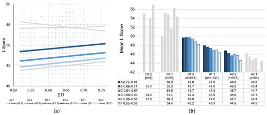 Similarly, Figure 7b shows a scatterplot of L scores plotted against GR scores, with linear regression lines generated separately for each test room. This visualization replicates a similar format reported in [43], where a large deviation of regression lines was observed between favorable and unfavorable test rooms, especially among lower proficiency participants. In the present data, the regression lines for the three rooms appear to be less pronounced with relatively similar slopes overall. However, it can be observed that the regression line for Room 11 lies consistently below those of Room 12 and 13. Moreover, the relationship between Room 11 and 13 seems to mirror a similar pattern observed in [43], with greater separation in the lower proficiency range and convergence at the higher end of the GR distribution.