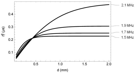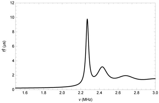 In a concrete example, we can consider a waveguide with the thickness mm tapered in an area with a smaller thickness of mm, of length d; the velocity of the transverse waves is set to m/s, which is typical of aluminum. In this case, it is found that the cut-off frequency of the evanescent wave zone is MHz. In Figure 2, the phase time is graphed as a function of frequency for the first mode and a barrier mm long. To be noted, the barrier resonances above the cut-off frequency and the monotonic decrease in traversal time below the cut-off frequency.