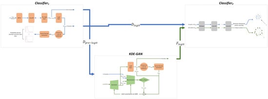In this study, we first select a closed-set classification algorithm and a closed-set classification model, denoted as , to conduct preliminary classification of environmental audio targets. From this, we obtain the output vectors from the pre-logit layer (the second-to-last layer of the network) which serve as the training set for sample generation. Subsequently, we employ a KDE-constrained GAN to generate edge samples in the layer (this is due to the fact that samples situated at the edges of the pre-logit layer do not necessarily align with those at the edges of the layer, thereby necessitating constraints at the layer), resulting in a series of edge sample datasets, . The training of the KDE-GAN is accomplished through a combination of the original GAN optimization objectives in the pre-logit layer, along with the Density Loss and Offset Loss in the layer. Finally, we design a two-stage classification model, denoted as , utilizing and as datasets. We implement attractors and reciprocal point learning algorithms as optimization objectives to complete the two-stage training process. During this process, the data in are pushed away from low-density regions by the counterpoints while maintaining strong intra-class cohesion under the influence of attractors. Concurrently, the data in are constrained to remain within low-density regions. The overall process is illustrated in Figure 1, with detailed architectural components visualized in Figure 2, Figure 3 and Figure 4.