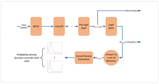 Given that the layer dataset comprises high-dimensional vectors and considering that environmental audio datasets are typically smaller than image or text datasets, fitting their distribution poses a challenge. Furthermore, generating edge data for each class of samples is essential. If the original data are represented as several hyperspherical distributions, edge samples are located at the peripheries of these hyperspheres, complicating visualization. To facilitate modeling, we partition into C subsets , compute the center points for each class, and derive the corresponding distances to form a new one-dimensional dataset , where represents the distance set for the ith class. For any , the calculation formula is as follows: