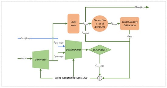 Open-set samples are inherently unknown, making it challenging to apply even the most advanced closed-set classifiers to open-set recognition problems. As discussed in the introduction, UIK samples are particularly difficult to differentiate, as they may lie closer to the sample center. In this study, we focus on distinguishing between USK and UO samples. UO samples can be effectively rejected based on their distance from the sample center, while USK samples are treated as interference items. These USK samples typically surround the clusters of known samples, significantly complicating the model’s decision-making process. To address these challenges, this section introduces the use of a KDE-constrained GAN for the generation of edge samples, aimed at enhancing the dataset. This approach seeks to improve the model’s ability to recognize and differentiate between closed-set and open-set scenarios by augmenting the training data with strategically generated edge samples. To address the challenges of high-dimensional environmental audio data points and the relatively limited dataset size compared to image datasets, which often lead to training difficulties, we propose a sample generation strategy leveraging the pre-logit layer vectors to adapt to the unique characteristics of audio samples. Specifically, the pre-logit feature representations are utilized to guide the Generative Adversarial Network (GAN) in synthesizing augmented samples. Furthermore, to ensure the quality and diversity of generated samples, Kernel Density Estimation (KDE) is introduced as a constraint during GAN training, effectively regularizing the generation of boundary samples that lie near the decision regions of the classifier. This approach enhances the model’s robustness and generalizability by enriching the training distribution while maintaining alignment with the intrinsic statistical properties of the original audio data.