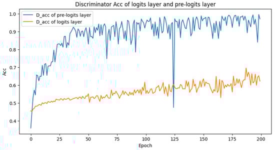 Therefore, this research proposes using the pre-logit layer output (i.e., the layer preceding the logit output) as the GAN’s input to optimize the generator design. In this section, since the generated samples are high-dimensional vectors that are difficult to evaluate directly, we leverage the discriminator’s accuracy as an indirect measure of the generator’s performance. This is possible because the generator and discriminator engage in a zero-sum game during training. Under the constraint that the generator’s input dimension must be smaller than its output dimension, samples are generated at both the pre-logit and logit layers, with the discriminator’s accuracy curves visualized as shown in Figure 5.