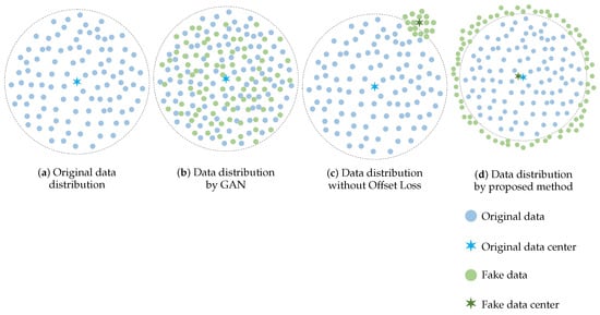 Figure captions depict the distribution of original and synthetic samples: (a) Original data distribution. (b) Data distribution generated by the GAN, trained using the original optimization objective function. (c) Data distribution resulting from GAN training with the original optimization objective function and Density Loss, but without Offset Loss. (d) Data distribution produced by the proposed method, where the GAN is trained using the original optimization objective function, Density Loss, and Offset Loss.