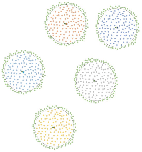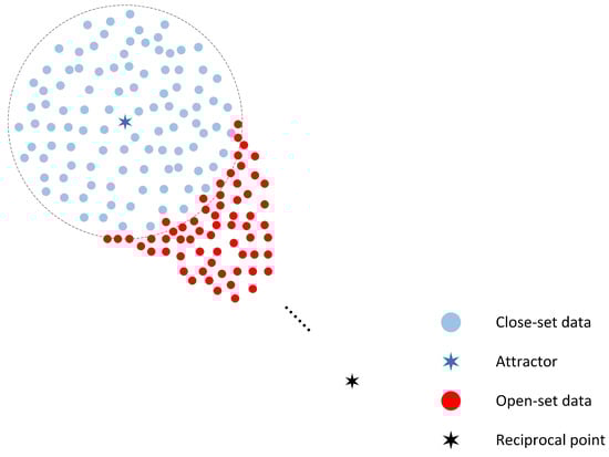 Firstly, the attractor should be positioned as centrally as possible within a class of sample points, while the reciprocal point should be maximally distinct from these samples. Thus, the relative position and angle of both the reciprocal point and the attractor in the feature space are critical. To minimize open-space risk, it is essential to cluster each class of samples tightly while also limiting the overall distribution range of all samples, effectively reducing the spread of known samples in open space. When employing Equation (20)-1 for probability calculations, the constraint only considers the difference . This may lead to situations where becomes excessively large, diminishing the relevance of . Consequently, even if is substantial, it might still satisfy the equation, inadvertently expanding the sample distribution range and increasing open-space risk. Our training objective should ensure that sample points lie within the vicinity of both the attractor and reciprocal point, remaining close to the attractor while distancing from the reciprocal point, as illustrated in Figure 9.