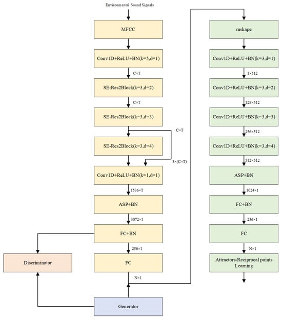 For , the input vectors first undergo dimensionality transformation to ensure a feature dimension of 3. A Conv1D+ReLU+BN layer then maps the features to 512 dimensions while retaining a channel dimension of 1. This is followed by three sequential Conv1D+ReLU+BN layers that progressively expand the channel dimensions to 128, 256, and 512, with dilation rates incrementally increased to capture multi-scale temporal features. After feature extraction, the ASP module compresses the dimensionality to 1024. Two FC layers further reduce the dimensionality to N. The final output undergoes Attractor–Reciprocal Point Learning to update the network parameters.