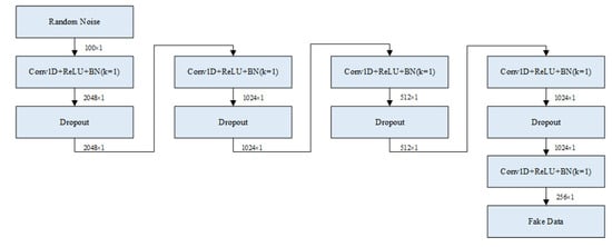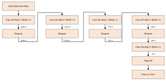 In the (Figure 12), the input random noise (dimension 100) passes through four Conv1D+ReLU+BN and Dropout modules, with intermediate dimensions of 2048, 1024, 512, and 1024. A final 1D convolutional layer reduces the dimensionality to 256, producing synthetic data points.