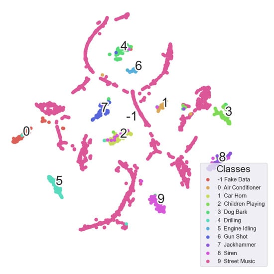 Taking the UrbanSound8K dataset as an example, Figure 14 illustrates the t-SNE visualization of both the pre-logit output vectors from and the generated samples. The results demonstrate that the generated samples are distributed around the periphery of known samples while maintaining minimal overlap with them, which aligns with our objective of generating samples with distinct distributions from known classes. This provides empirical evidence that our proposed data augmentation method can effectively generate samples resembling unknown classes. Furthermore, the distance histogram distribution shown in Figure 7 confirms that these generated samples are predominantly located in the tail regions (edge positions) of known sample distributions. Collectively, these findings substantiate that our proposed algorithm can successfully generate edge samples that effectively simulate unknown samples in open-set recognition scenarios.