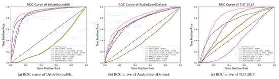 This figure presents the ROC curves for the UrbanSound8K, AudioEventDataset, and TUT 2017 datasets under different algorithms.