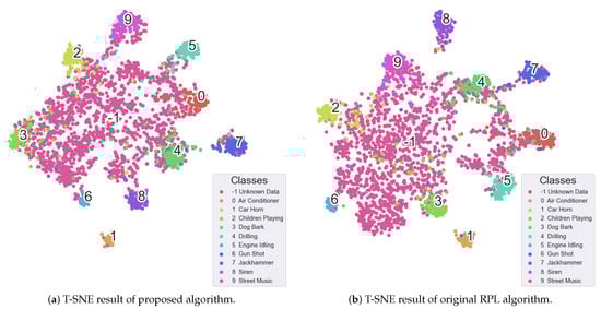 Finally, using the UrbanSound8K dataset as a case study, we conduct a comparative t-SNE visualization between the final output vectors generated by our proposed algorithm and those produced by the original RPL algorithm [18], with the results presented in Figure 16. The visualization results clearly demonstrate that the unknown-class data points generated by our proposed algorithm exhibit significantly more compact clustering compared to those produced by the original RPL method. As evidenced in Figure 16, our approach achieves superior intra-class aggregation particularly for samples belonging to Classes 1, 2, 4, 7, 8, and 9, with the class boundaries becoming more distinct and well-separated. This improved topological structure in the embedding space provides strong empirical evidence that our algorithmic enhancements effectively optimize the decision boundaries for environmental audio samples. The tighter clustering of unknown-class points suggests our method better captures the intrinsic characteristics of open-set environmental sounds, while the enhanced intra-class cohesion for specific categories indicates more robust feature learning capabilities. These visual patterns corroborate our quantitative findings and confirm that the proposed modifications to the RPL framework successfully address its limitations in handling the complex acoustic patterns characteristic of environmental audio data.