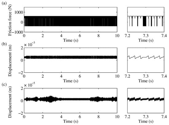 Simulated time signals for the initial conditions and : (a) friction force acting between the pad mass and belt, (b) displacement of the first pad mass, and (c) displacement of the axle mass.