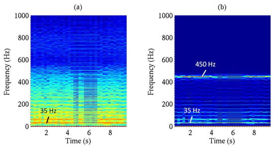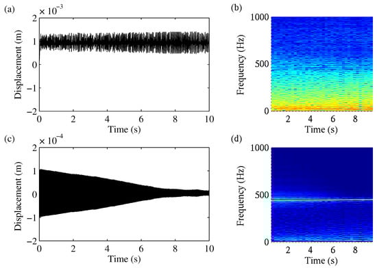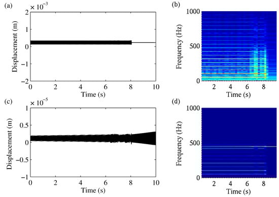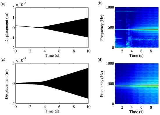 Figure 7 shows the related spectrogram of the pad and axle displacements. The axle mass oscillated harmonically with a frequency of 450 Hz. After a transient phase with a broadband characteristic, the pad also oscillated harmonically with the same frequency. The results obtained after the small initial perturbation of the axle mass are comparable with the measured signals during honk noise, as described in Section 3.1.