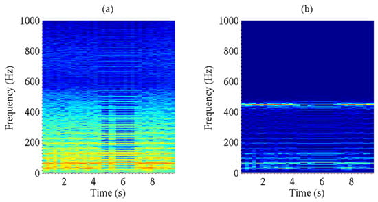 Spectrograms of the system displacements for the initial conditions and : (a) pad mass and (b) axle mass.