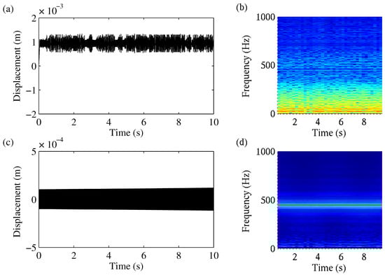 The equations of motion were integrated using the Euler method with a step size of . For a clearer visualisation, and as the pad masses and behave in qualitatively the same way, in the following figures, only the displacement signals and spectrograms of the first pad mass are illustrated.