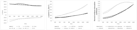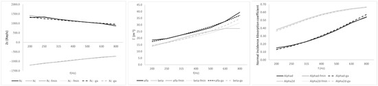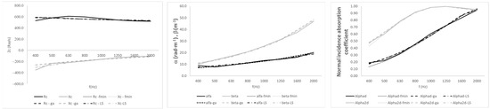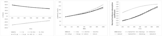 The real part and the imaginary part of the specific impedance, and , are adjusted separately. The real part and the imaginary part of the sound propagation constant, α and β, respectively, are also adjusted separately. Three different kinds of adjustments are proposed. The first adjustment is based on Matlab’s “fminsearch” function. The values to be estimated are as follows: