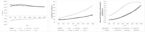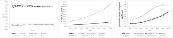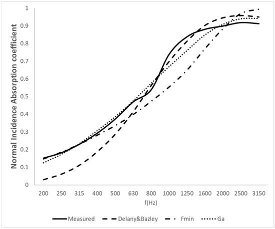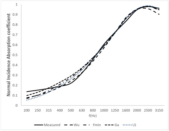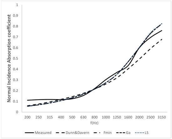 Table 2, Table 3, Table 4, Table 5, Table 6, Table 7 and Table 8 show the coefficients adjusted by the three methods for all the materials. The mean absolute error of each adjustment is also included. The coefficients obtained for each material are quite similar. The errors obtained are also very similar. This indicates that any of the models could be used. We should highlight the case of sample M3: Polyurethane foam 4 cm, in which there are coefficients greater than 1 for the Fmin and LS models. In this case, it is advisable to use the Ga adjustment, which keeps the coefficients between 0 and 1. The errors are expressed as absolute values and share the same units as the corresponding variable in each case.