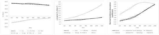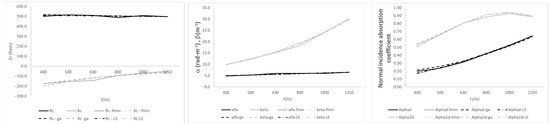 Broadly speaking, the three methods converge into consistent solutions with a relatively low error. The value of the real part of the characteristic impedance is the most complex factor. Broadly speaking, “fmin” and “ga” return a slightly lower error than LS. Moreover, it can be seen that, in the case in which the adjustment returns values above 1 (or negative ones), the “ga” method is the only one that prevents one. This can be seen in the case of polyurethane foam 4 cm, in which this situation occurs.