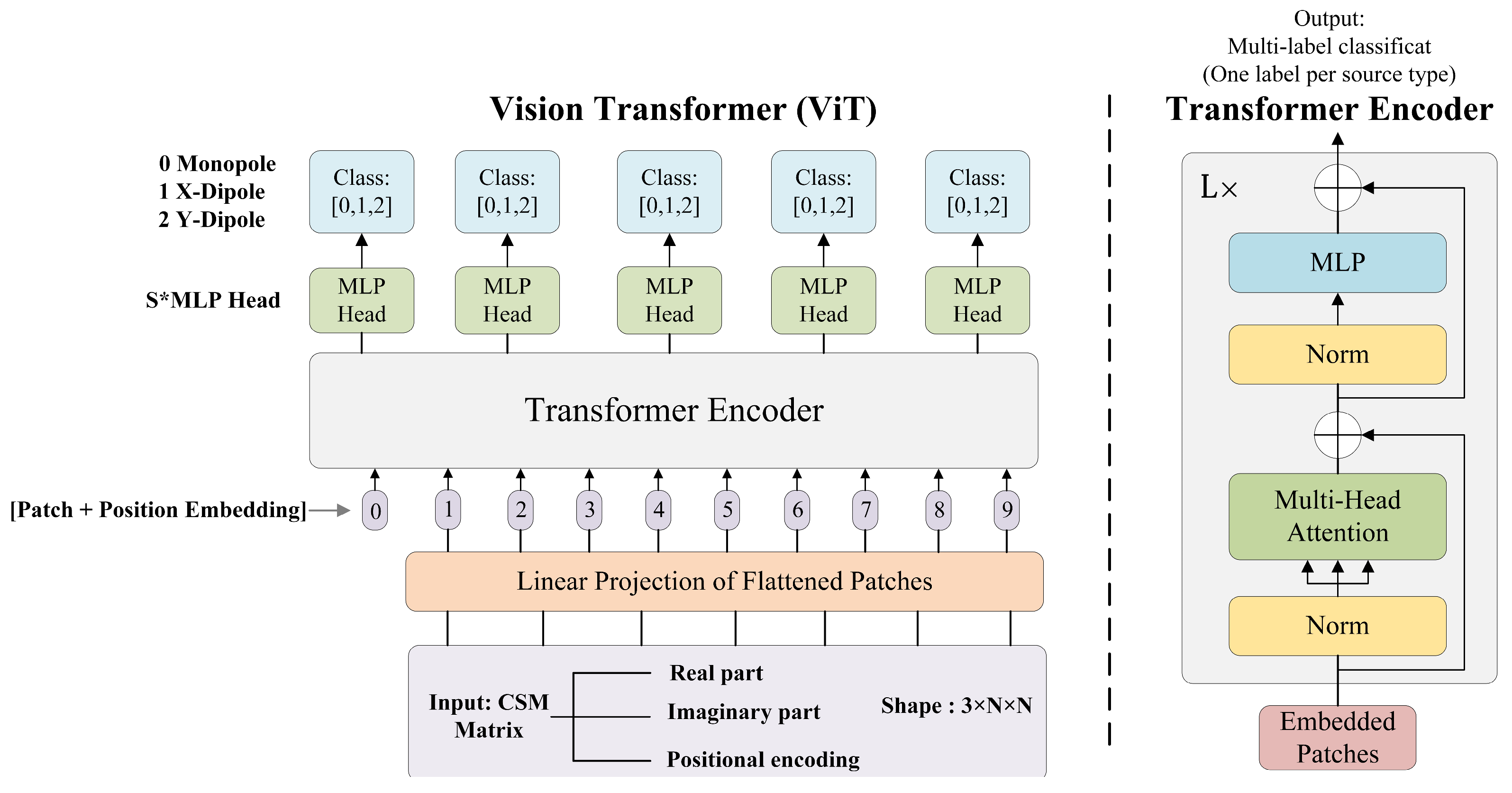 To achieve efficient identification of multiple source types in complex sound fields, this study designs a multi-label identification model based on the ViT. The model takes the image constructed from the CSM as input and leverages ViT’s strength in capturing global dependencies to jointly identify different physical source types (monopole and two directional dipoles). In this work, the CSM at the target frequency is converted into a three -channel image for input to the ViT. The first channel is the real part of the CSM, the second channel is the imaginary part of the CSM, and the third channel is a spatial positional encoding derived from the source localization results. To construct this positional encoding, the estimated source coordinates are normalized and mapped onto an scanning grid (matching the CSM’s dimensions), producing a matrix that reflects the prior spatial distribution of the sources. We then normalize each of these matrices and stack them to form a tensor-effectively treating the CSM data as an image with three channels. This CSM image preserves both the amplitude and phase information of the acoustic field while incorporating spatial context, allowing the Vision Transformer to learn global features for improved monopole and dipole source identification.