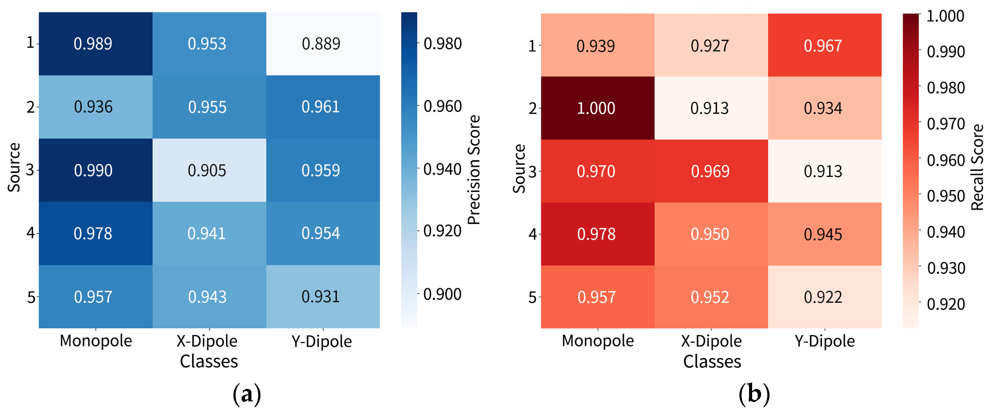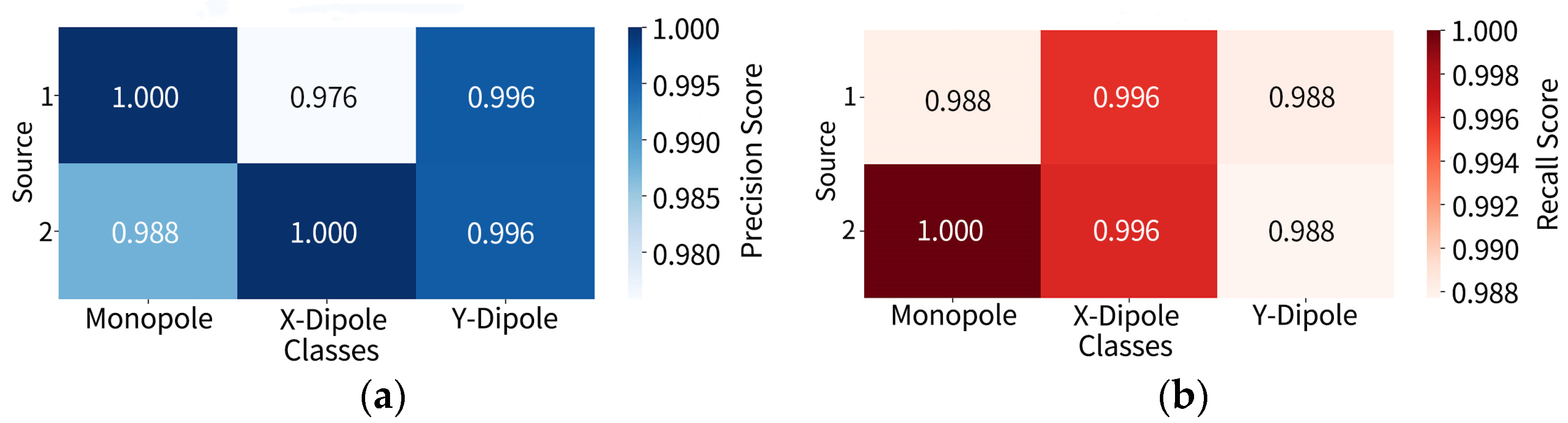 -direction dipoles, the minimum precision is 0.827, and the minimum recall is 0.867, indicating that this category poses greater challenges for structural discrimination under complex configurations. In contrast, although monopoles also experience some misidentification, their precision and recall remain relatively stable overall, reaffirming the distinctiveness of their radiation characteristics.