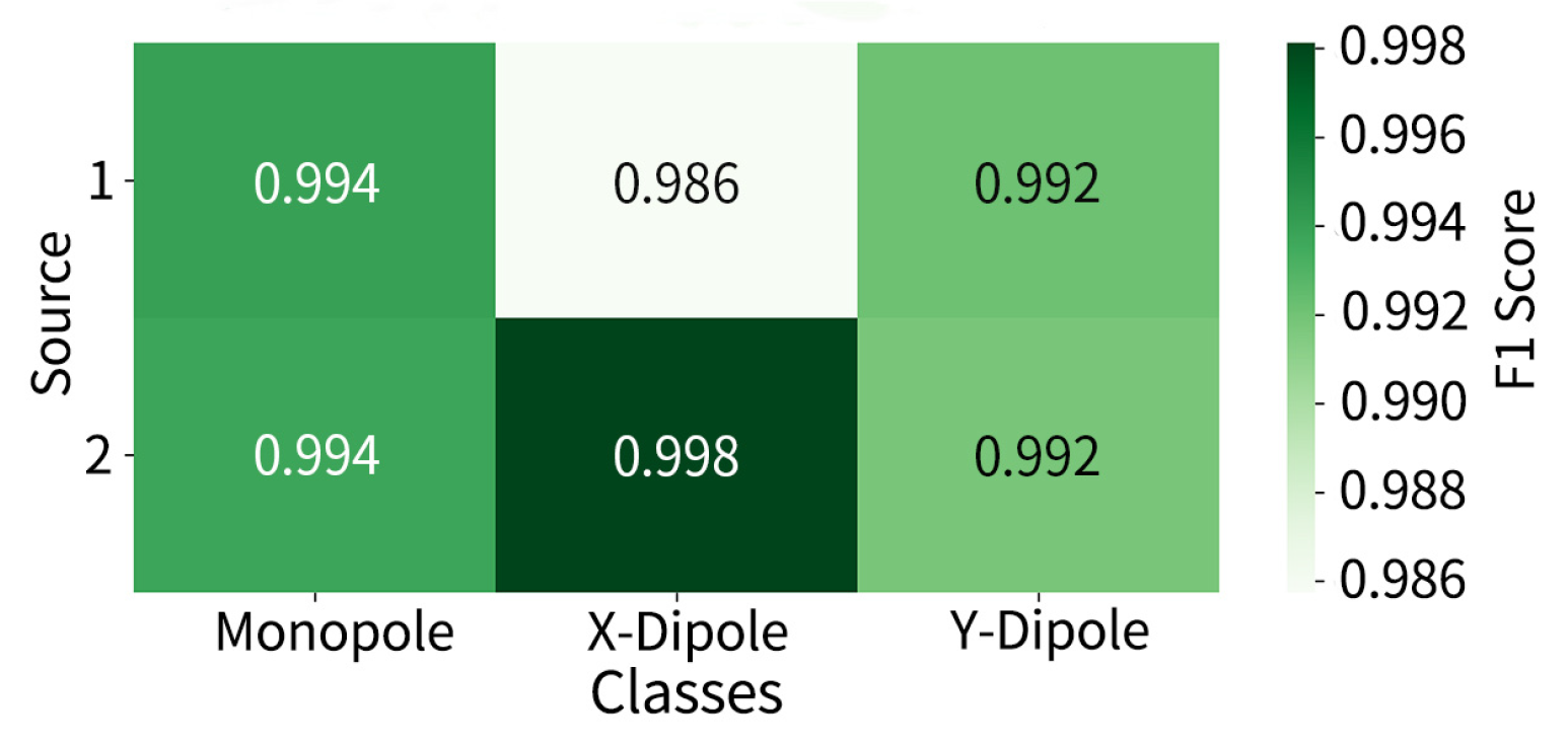 -direction dipoles. The overall misidentification rate remains low, though slightly higher than that observed in the two-source scenario, with a noticeable increase in mutual misidentification s between dipole types. The F1-score heatmap further is shown in