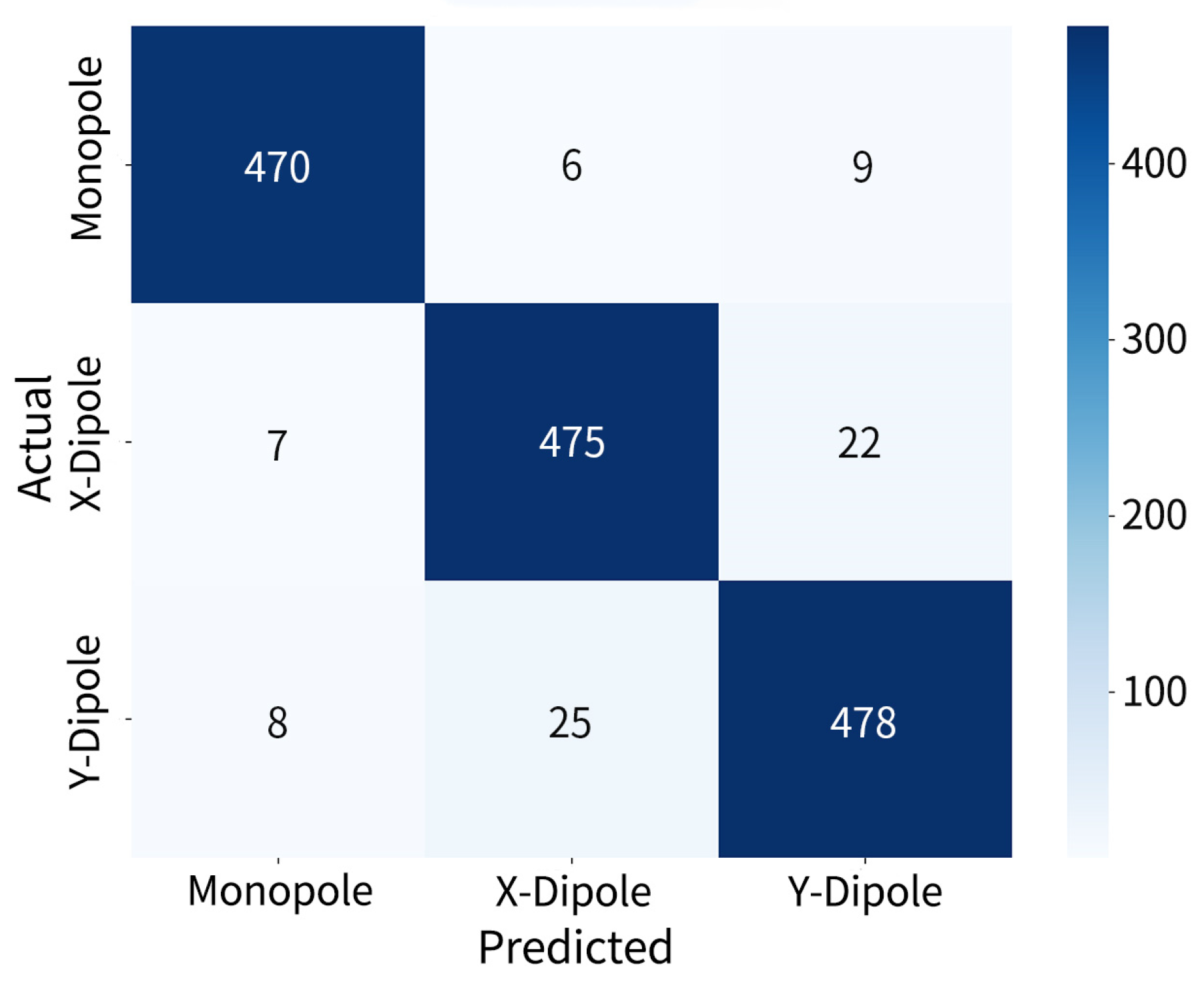 -direction dipoles reached 487 out of 490, 508 out of 510, and 492 out of 498, respectively. The overall misidentification rate is extremely low, with minor confusion observed only between