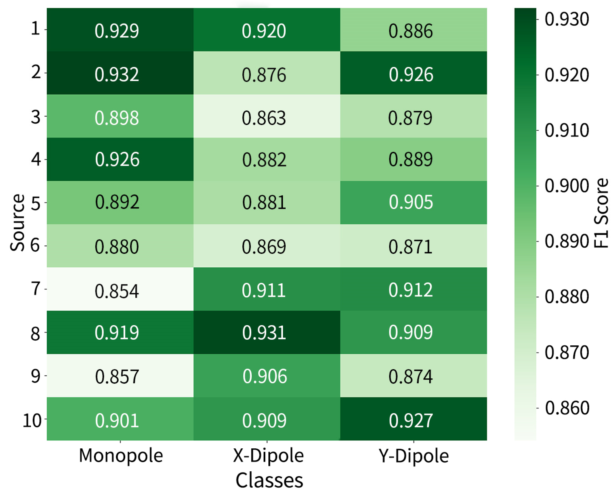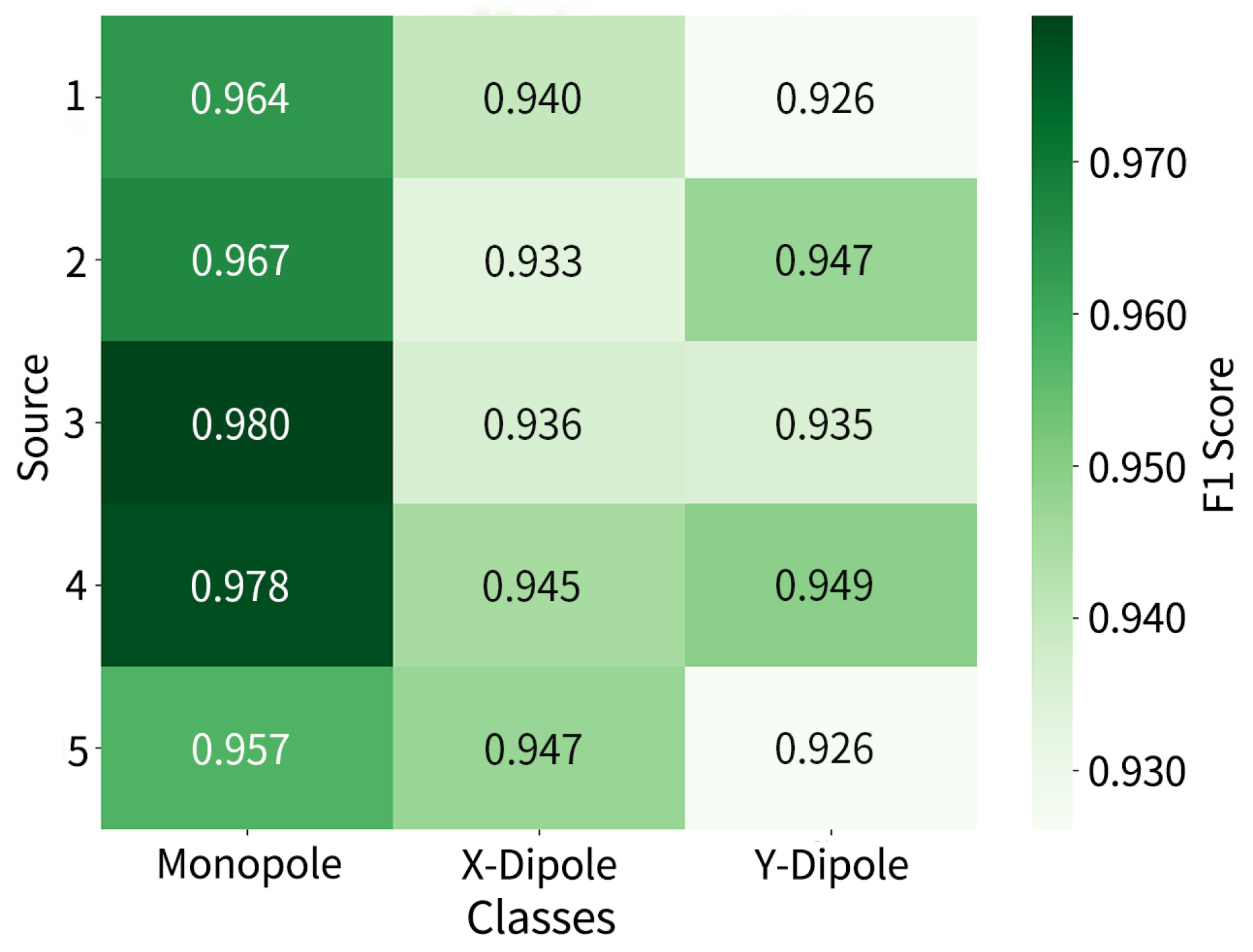 Figure 8 which reveals the identification performance distribution of each source across different categories, with scores generally ranging from 0.926 to 0.980. Monopoles remain the most consistently recognized category, while the F1-scores for