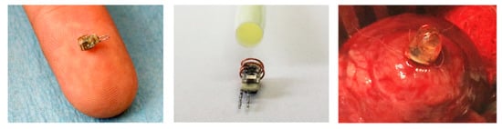- Charthad, J.; Weber, M.J.; Chang, T.C.; Arbabian, A. A mm-Sized Implantable Medical Device (IMD) with Ultrasonic Power Transfer and a Hybrid Bi-Directional Data Link. IEEE J. Solid State Circuits 2015, 50, 1741–1753. [Google Scholar] [CrossRef]