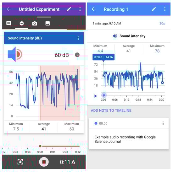 Example of an experiment with Google Science Journal targeting sound intensity recording (left) and reporting (right).