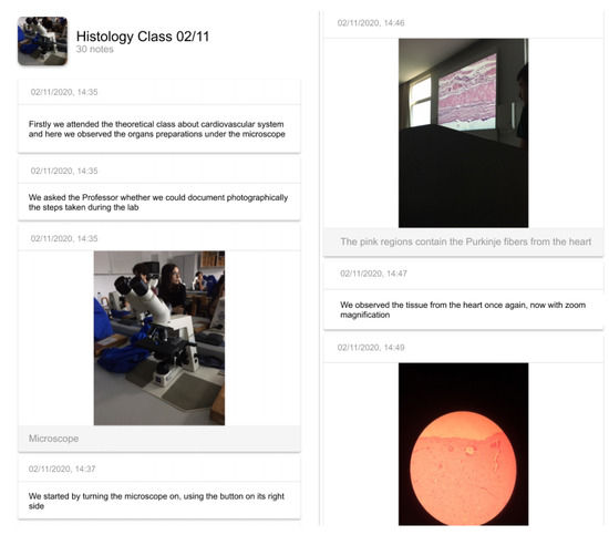 In its simplest form, the GSJ allows users to document the performed experiments, and create a digital report as a result. In such journals, students can write and keep relevant information, including both notes from the lecture and from their experiments, as well as photographs to illustrate them. Moreover, journals can be organized by the user through titles, plain text and caption images, and shared within the class. Figure 3 illustrates an excerpt of the report made by a group of students during an experimental class of a Histology course, describing the concepts learned, procedures followed, and image records from the studied tissues.