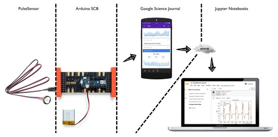 To support the case study we use a PulseSensor (https://pulsesensor.com/) PPG sensor. Power is provided by the Arduino SCB using the 0–3.3 V pins and the analog output is connected to the analog input on the SCB; all the connections are made via the Molex Sherlock pins on the SCB. Within the GSJ mobile app, a new journal is created with the information about the experiment and procedure. A subject is asked to sit down with the PulseSensor placed on his index finger, enabling a visualization and recording of the PPG time series on the journal. The next step is to export the data to a CSV file, and run the post-processing Python script, by means of a Jupyter Notebook, to process the data and compute the heart rate using the BioSPPy toolbox.