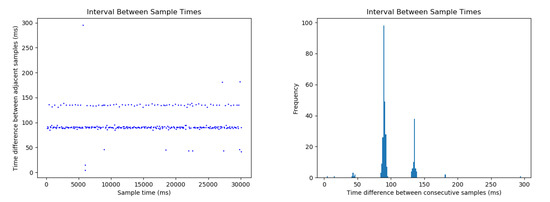 between sample times and throughout the duration of a recording (left) and as a histogram (right).
