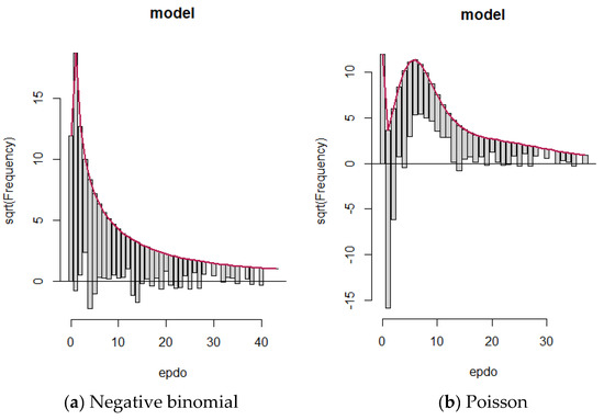 As discussed in the method section, the first line observed in these figures is related to the height of observations with zero value (EPDO = 0). As can be seen from rootograms, Figure 2a,b, the hurdle components of the models that model zero counts fit zero values quite well. It is expected for these models to fit zero count perfectly by design. However, when EPDO is equal to 2 or 3, while a dramatic under-fitting can be observed for Poisson distribution, the negative binomial layer could fit those values quite well.
