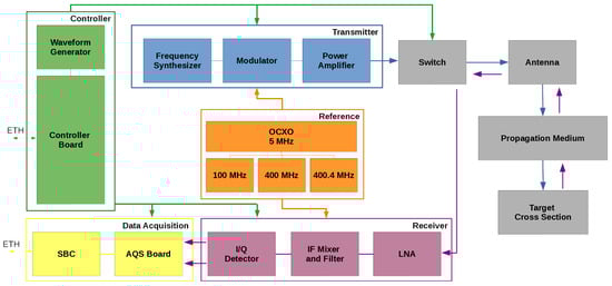 The receiver, depicted in Figure 1 in purple, includes an analog chain that is responsible for amplifying the signals (target echoes) to the required digital entry levels of the acquisition board (yellow). The receiver starts with a low noise amplifier (LNA), internally developed, using GaAs technology, presenting a noise factor of 0.7 dB at 5.56 GHz. Next, there is a local oscillator at 5.160 GHz to convert it down to a 400 MHz intermediate frequency (IF). The local oscillator is provided by the same reference signal from the transmitter, guaranteeing a coherent conversion. The IF then passes through an IF filter and a digital variable gain amplifier (DVGA), which is connected to the controller board.