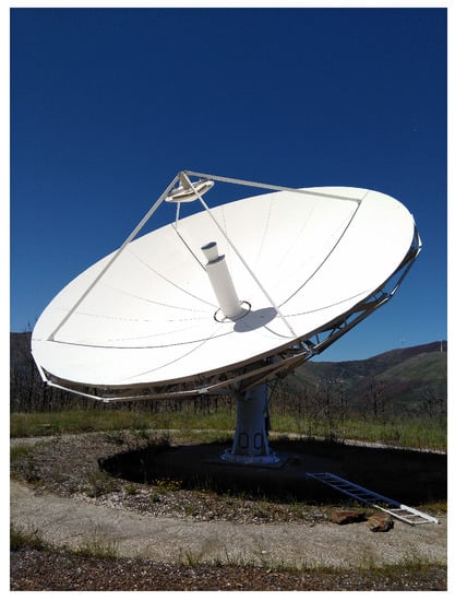 We obtained a Vertex RSI C band, 9-meter Cassegrain Antenna originally used for Satellite Communications in the Azores Terceira Island, Portugal. The antenna was moved to Pampilhosa da Serra, Portugal, a site with a low Radio Frequency Interference (RFI) environment []. New foundations, electrical power and lightning protection were installed at this new site. The mounting pedestal underwent a major adaptation in order to comply with a fast, continuous azimuth antenna rotation. Originally intended for radio astronomy surveys, this facility represents a step forward in our technological development and evolution of high-performance space radar instrumentation systems.