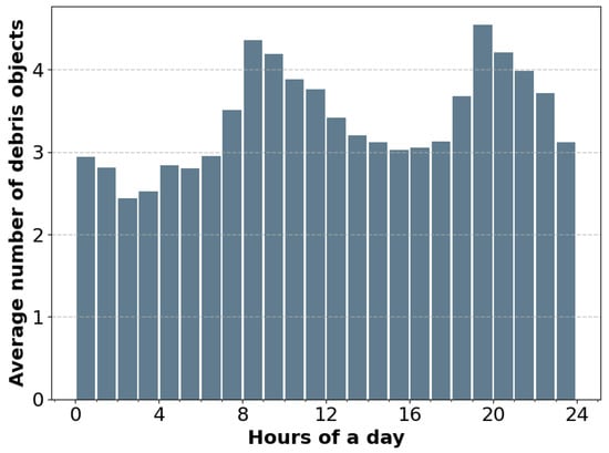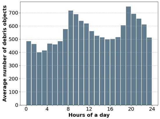 Since the catalogue does not provide detailed information about the objects RCS, it is not possible to filter out by RCS. All the objects were considered regardless of RCS and the filtering was done by minimum elevation and maximum velocity. Figure 3 depicts the number of expected observable objects during a complete day.