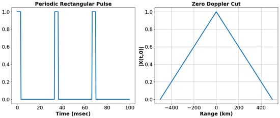 Figure 5 shows a rectangular pulse of 3.3 ms repeated at 30 Hz and the zero Doppler cut. Using a rectangular pulse results in a range resolution of 500 km which is unacceptable when detecting objects at a maximum of 1000 km.