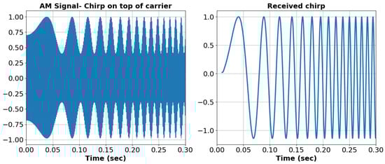 Figure 7 illustrates a simple case of AM chirp. The left side depicts a 1 kHz carrier modulated in amplitude by a chirp signal with , , and Hz. After carrier demodulation, filtering, and signal reconstruction in the digital domain, the chirp waveform is successfully recovered as depicted on the right side of Figure 7.