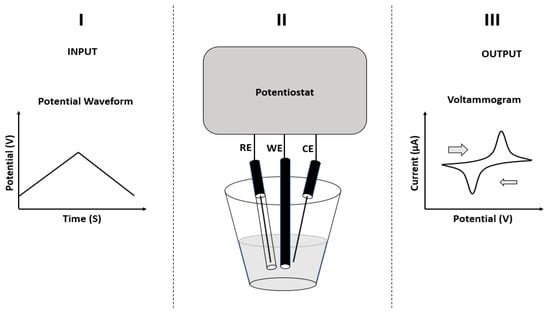 Cyclic voltammetry (CV) is a versatile electrochemical technique used to analyze redox status in a wide range of industrial and research settings. The common applications include evaluation of drug quality in pharmaceuticals [,], determination of phenolics and antioxidants in food and wine [], and label-free detection of biomolecules such as hormones [,]. Conventional CV measurements are performed with a three-terminal cell configuration consisting of a working electrode (WE), a counter electrode (CE), and a reference electrode (RE) as shown in Figure 1. The technique measures the current response to a sweeping voltage potential applied to the sample via the WE. CV is highly sensitive to the detection of low-molecular-weight antioxidants (LMWA), which play a vital role in defence against OS [].