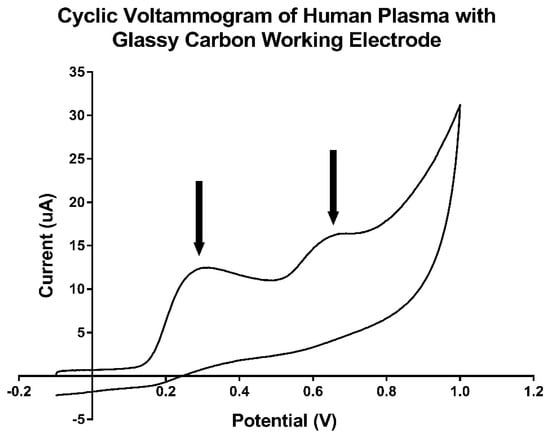 Example of cyclic voltammogram of human plasma with glassy carbon WE, Ag/AgCl RE and platinum CE. Scan range: −0.1 V to 1 V, as a scan rate of 100 mV/s. Black arrows indicate two intrinsic voltammetry peaks corresponding to redox-active molecules in the sample (see Section 3.3).